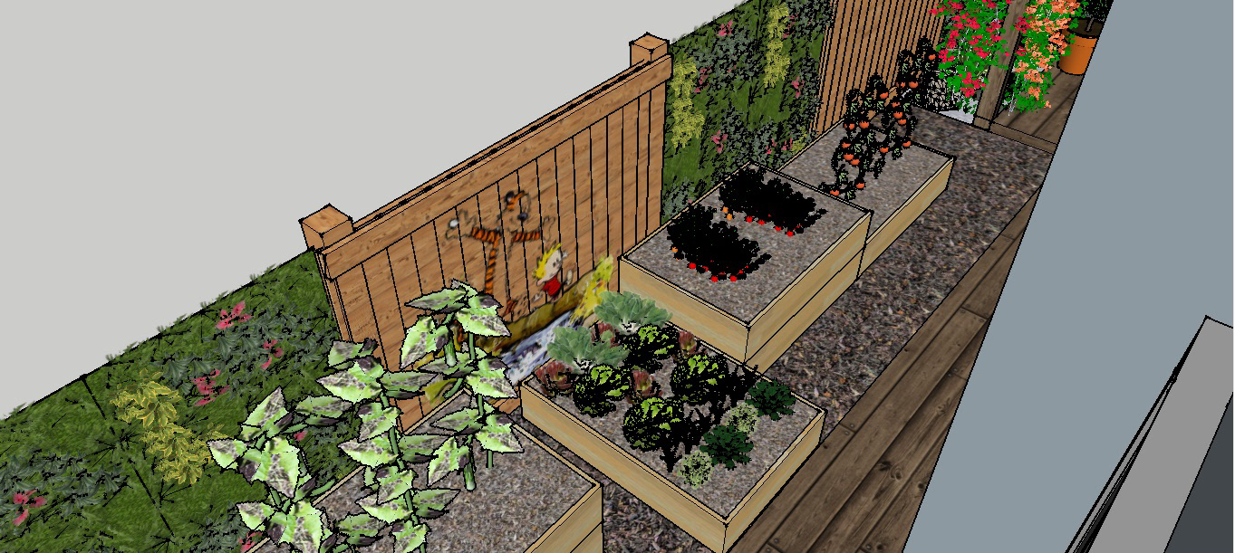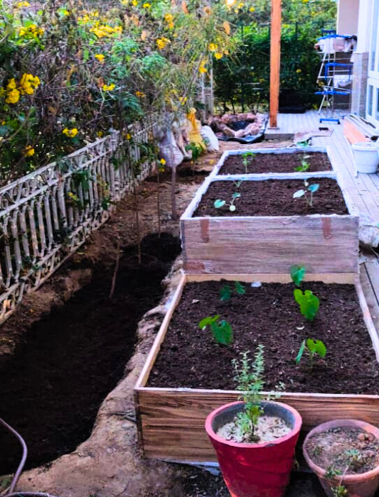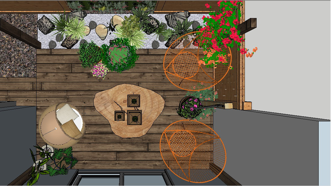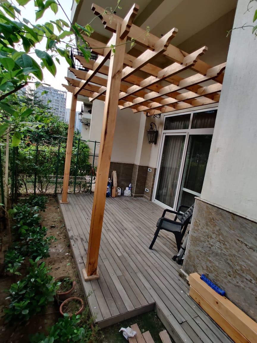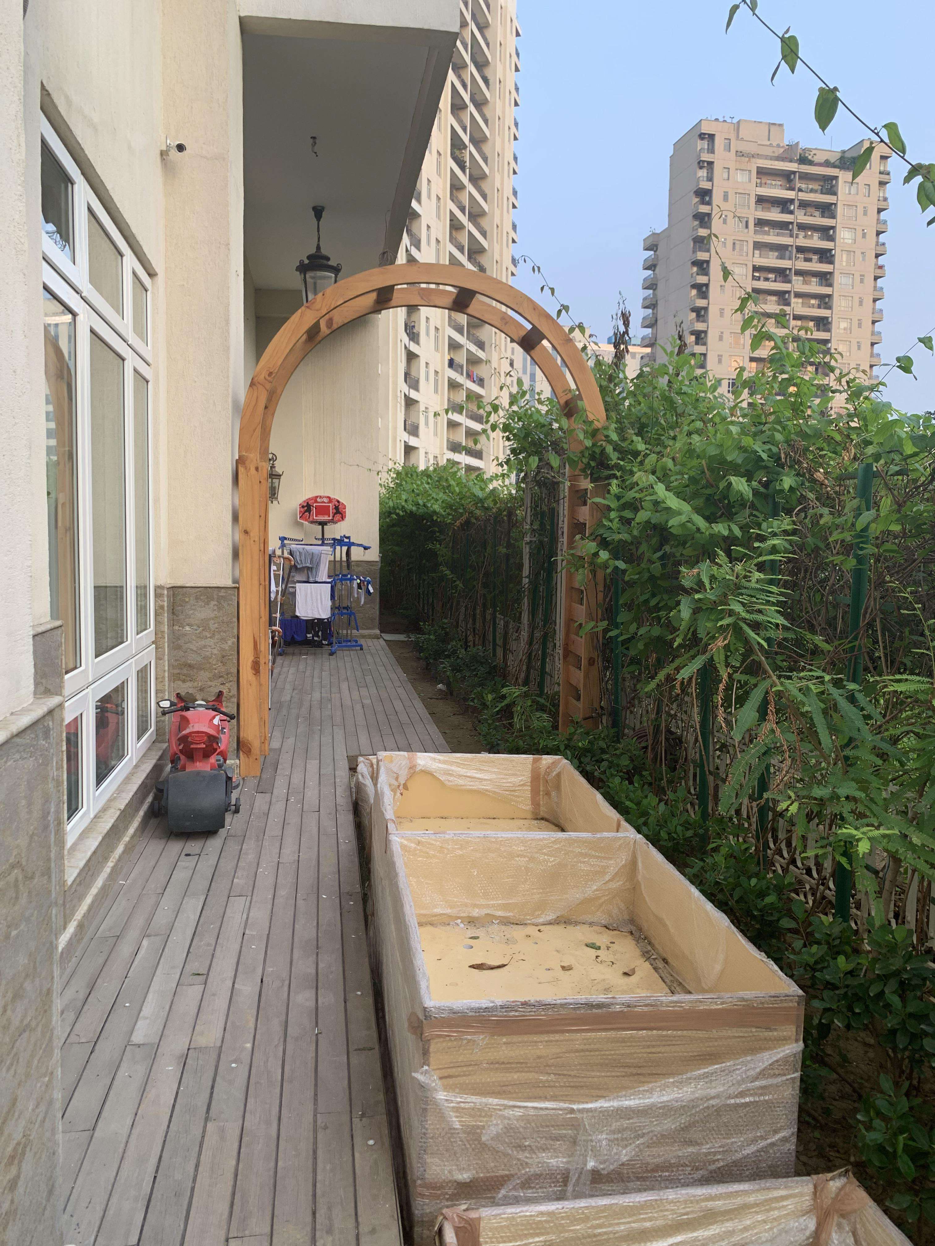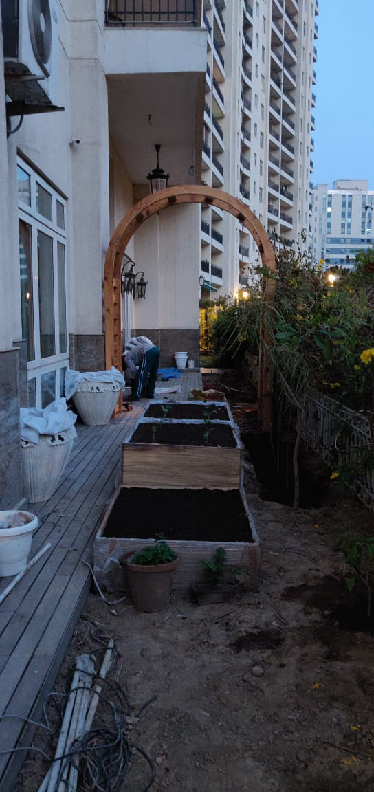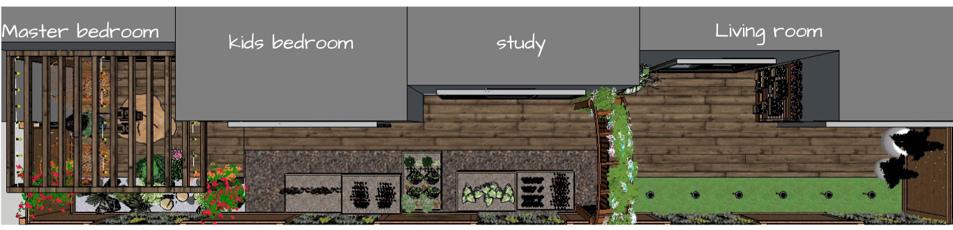 Solution: I decided to break the space into parts. In front of the living area I have provided a set up with grass, lights and a clean set up for a formal space. We go in through an entryway to the garden, an 11' tall wooden arch-way with climbers on both sides. As we move forward, I have set-up a square foot kitchen garden in front of the study and the kids room, completing the view from the owner's bedroom is a pergola with a casual sitting area and a dry garden in front of it.