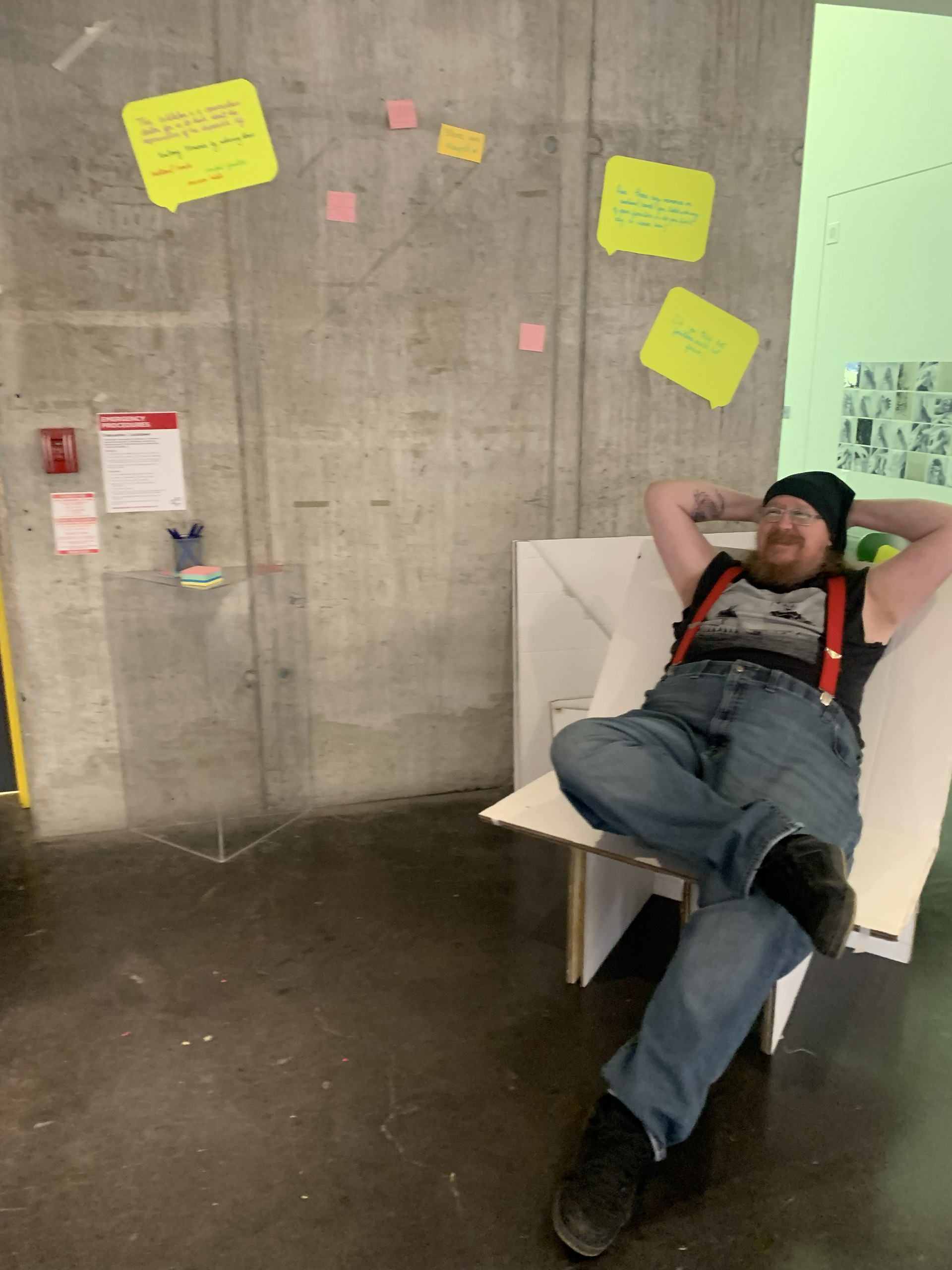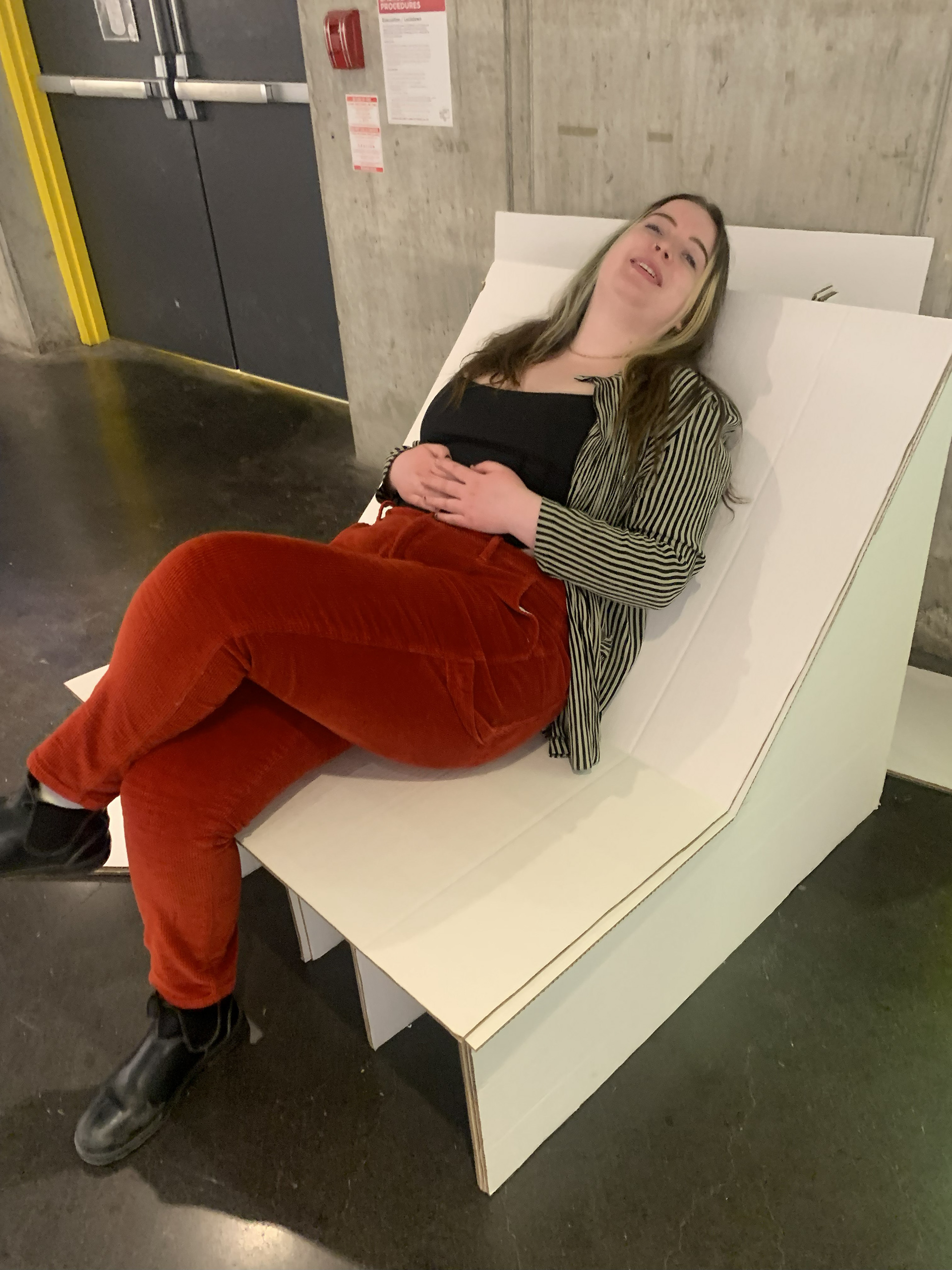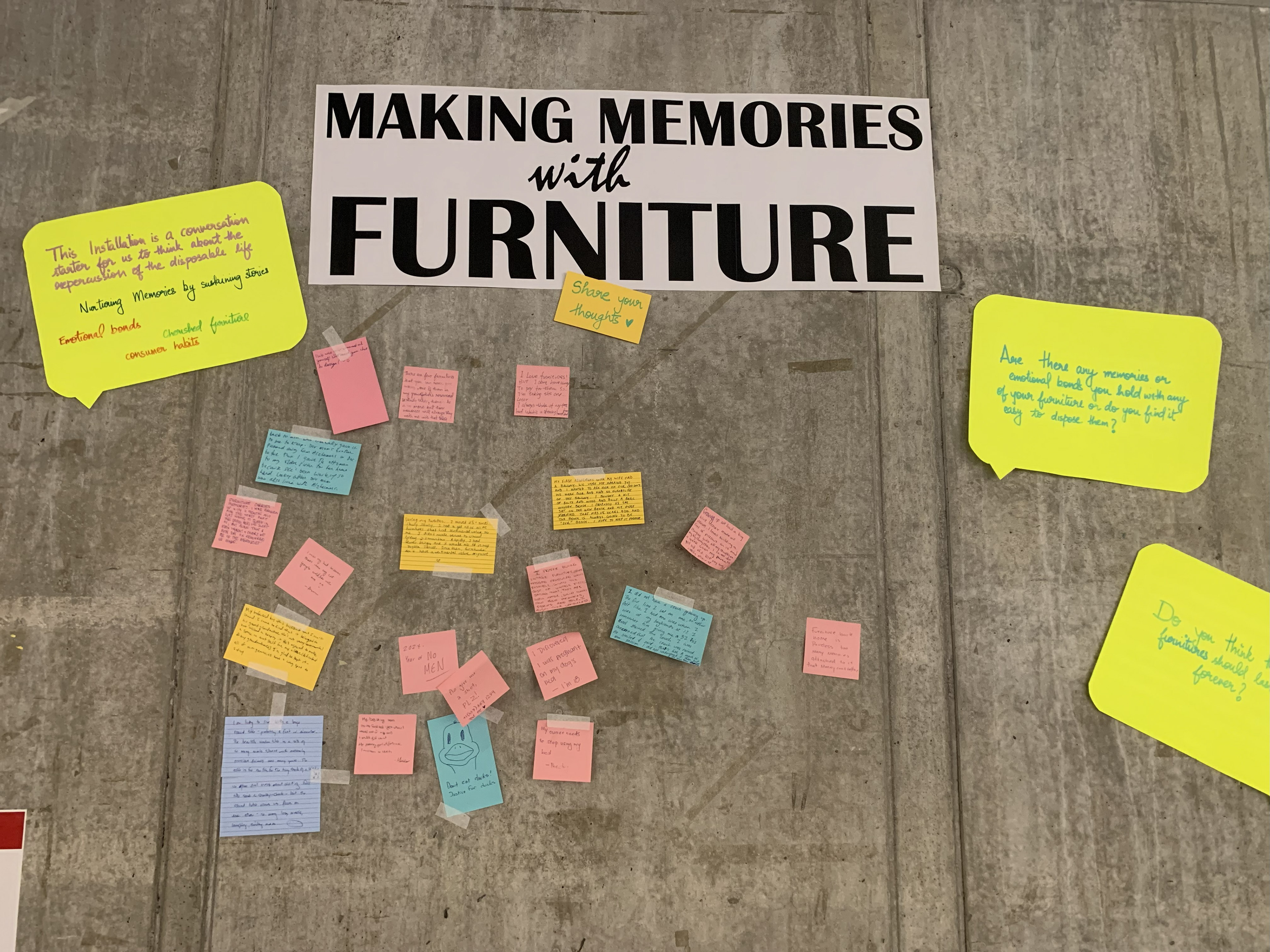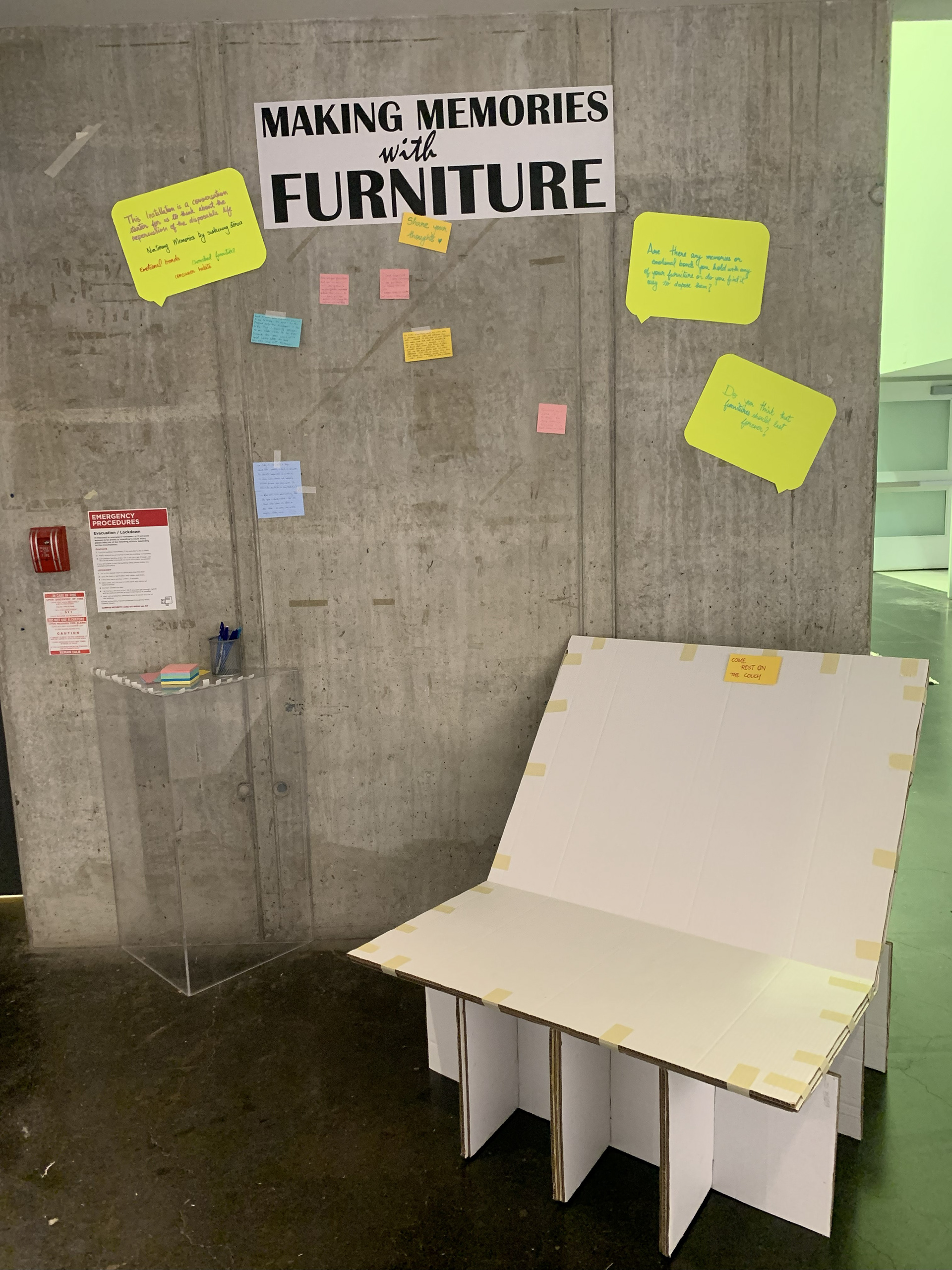 Ultimately, I crafted an exposed cardboard couch alongside a memory wall where visitors could share their own experiences and memories associated with furniture. Despite initial hesitation due to the positioning of the couch and concerns about its sturdiness, people were pleasantly surprised by the level of comfort it offered. This unexpected revelation highlighted the potential for inexpensive materials like cardboard to provide comfort and functionality in furniture design.